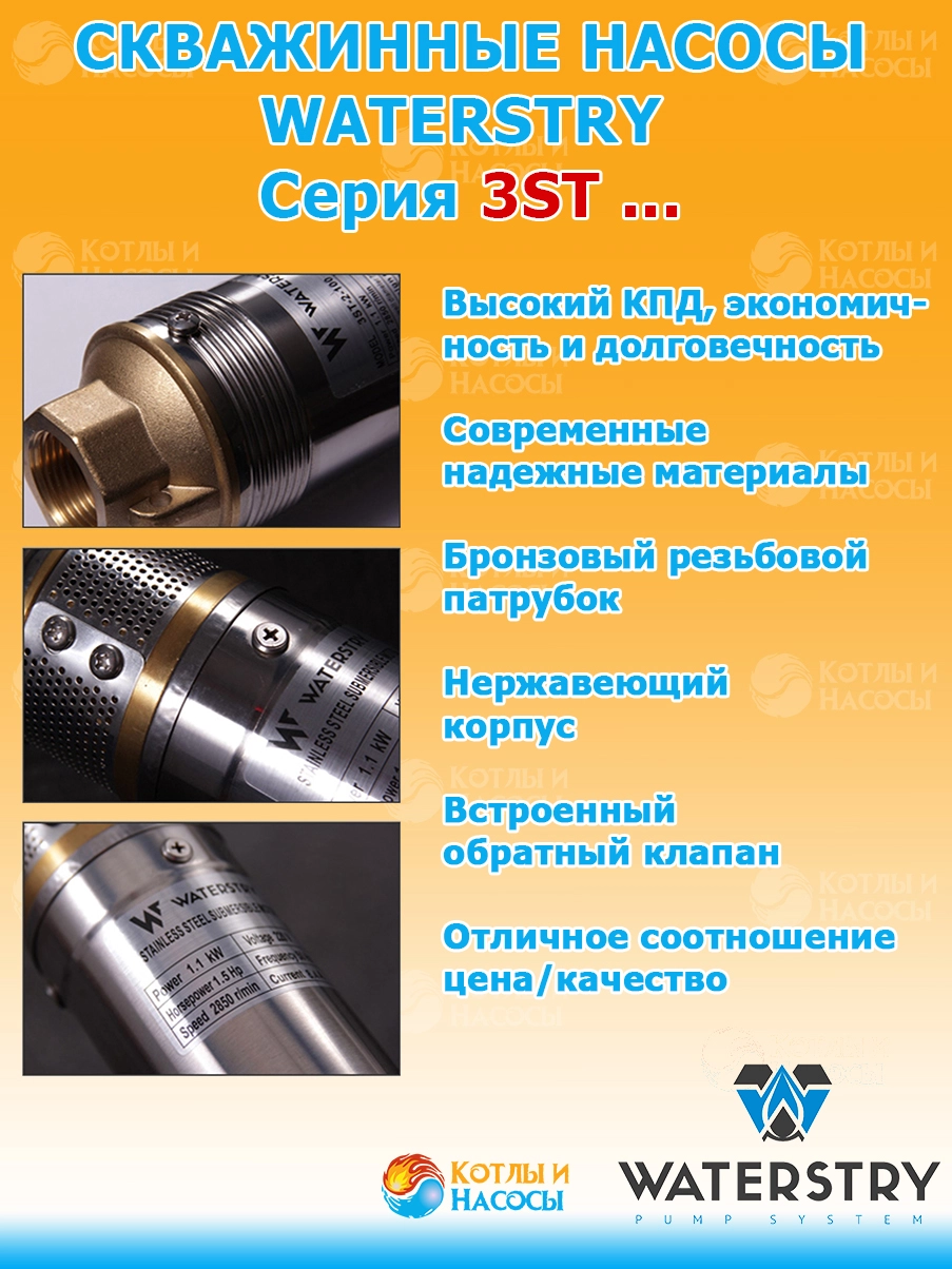 Встроенный обратный клапан, защитная сетка перед заборным патрубком дополняет ряд технических достоинств скважинных насосов Waterstry
