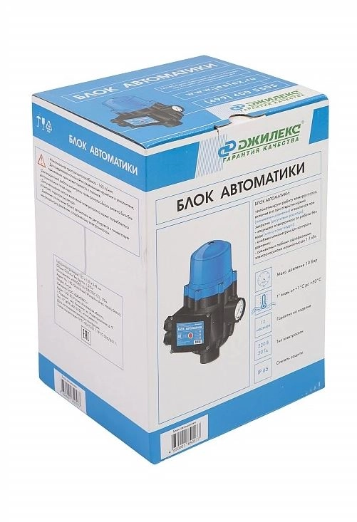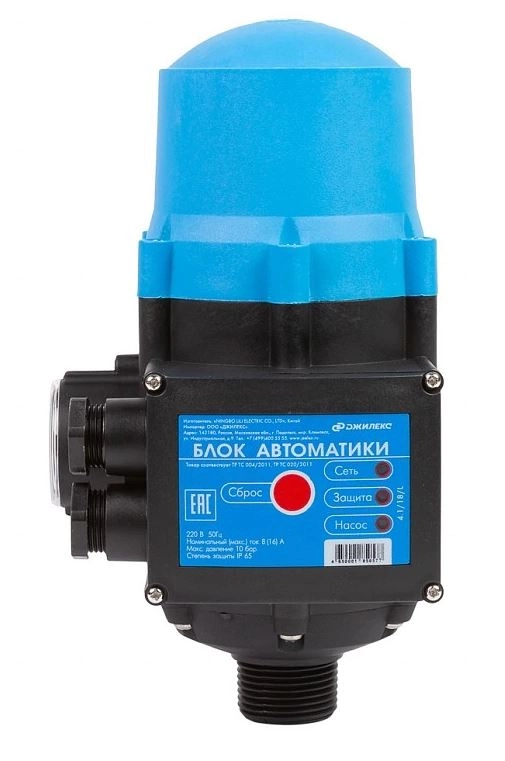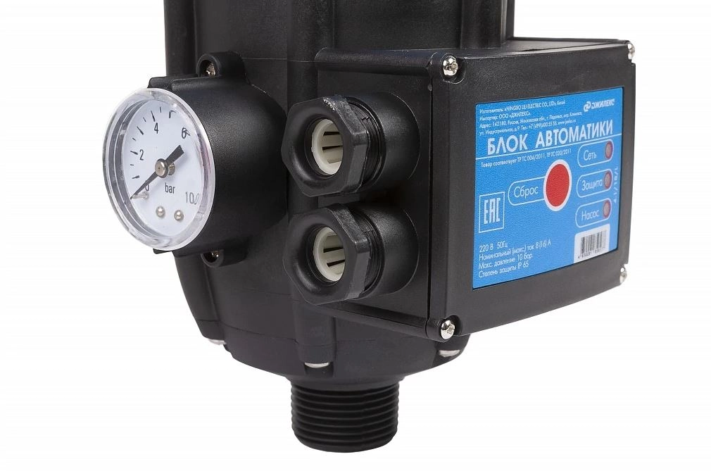 Блок автоматики «ДЖИЛЕКС» предназначен для автоматического регулирования работы насоса и защищает его в случае отсутствия воды (сухой ход). Помимо этого электроника запускает электронасос при снижении давления в системе, когда открываются краны, а также останавливает его, когда вода прекращает движение, когда краны закрываются. Блок автоматики комплектуется манометром, для зрительного контроля общего давления в системе, и реле давления.