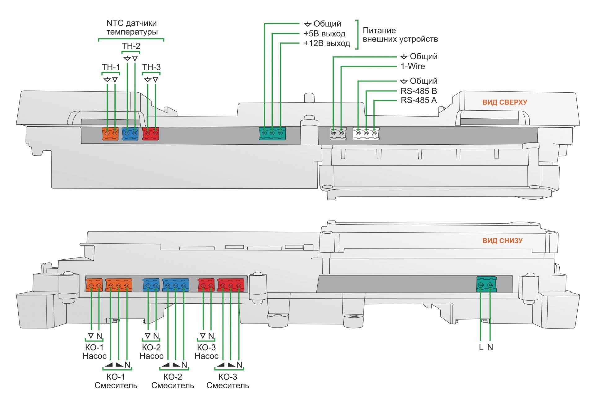 - Поддерживает подключение проводных датчиков температуры (цифровые и аналоговые NTC)