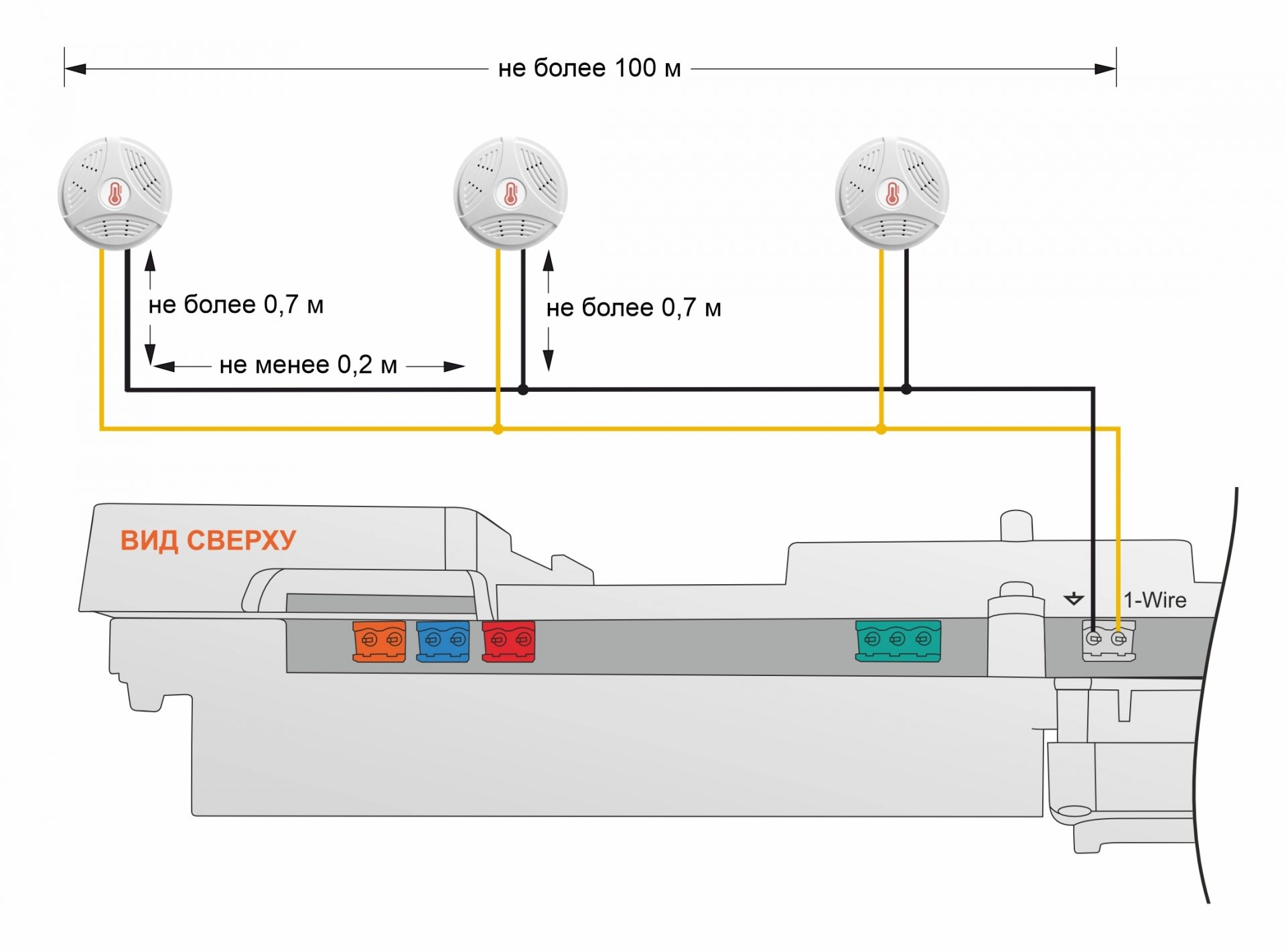 Для мониторинга температуры и применения ее значений в алгоритме управления системой отопления объектов, расположенных на большом удалении от регулятора ZONT Climatic.V2, реализован дополнительный интерфейс 1-Wire, контролирующий цифровые датчики температуры.