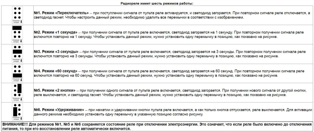 Радиореле имеет шесть режимов работы