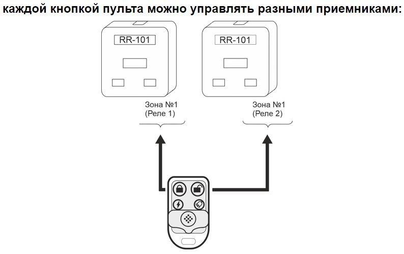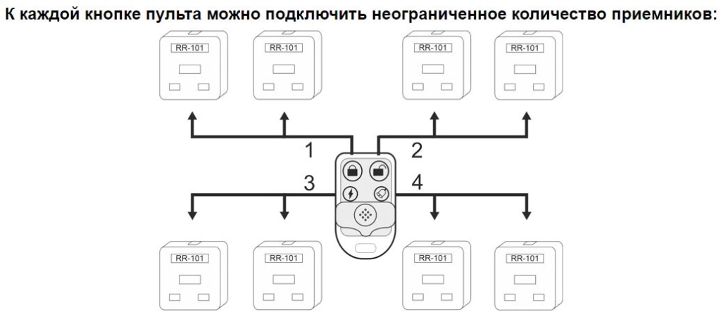 К каждой кнопке пульта можно подключить неограниченное количество приемников