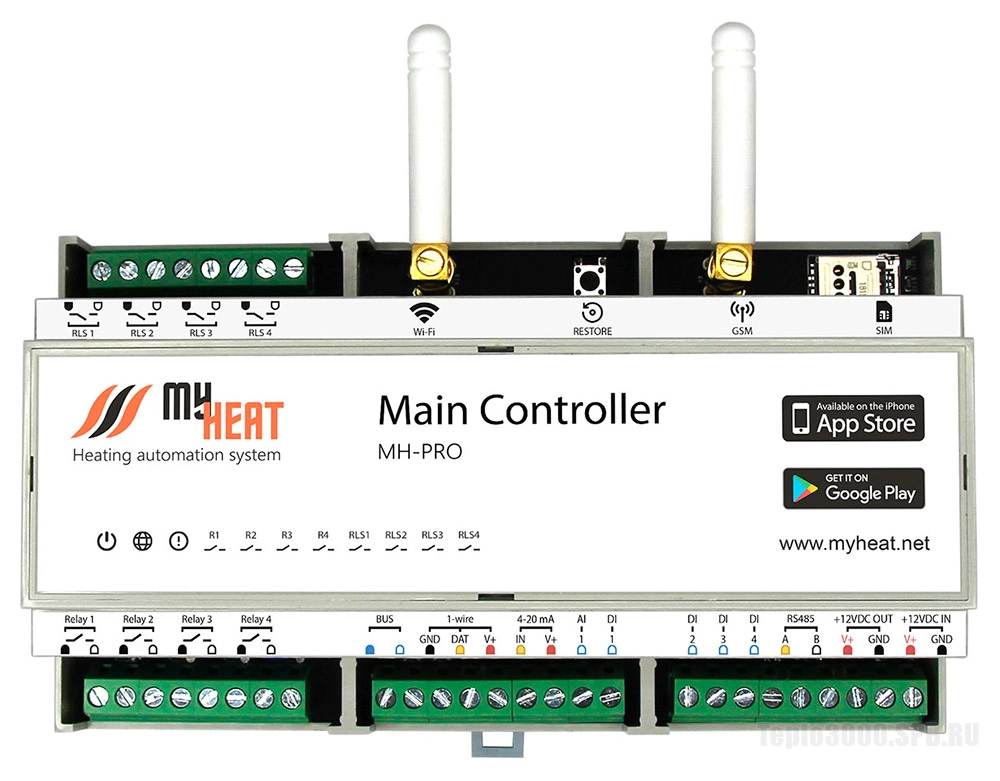 Контроллер MyHeat Pro предназначен для управления каскадом до 6-ти котлов, бойлером косвенного нагрева, насосами, смесительными узлами, 3-х и 2-х ходовыми клапанами, предоставляет возможность регулировать температурный режим до 64 сред отопления включительно. Осуществляет управление сложными системами отопления и горячего водоснабжения в частных домовладениях и небольших предприятиях.