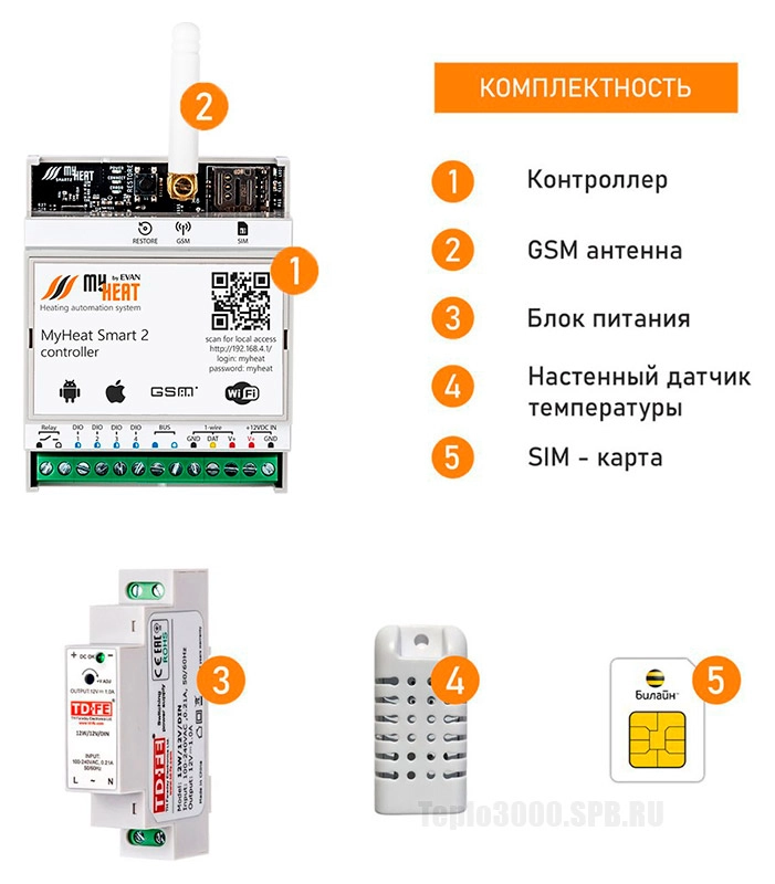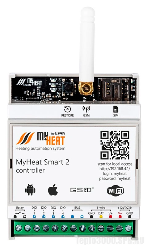 Контроллер MyHeat Smart 2 предназначен для управления простыми системами отопления в квартирах с индивидуальным отоплением и небольших частных домовладениях. Управление котлом по шинам Opentherm, EBUS, Navien, LPB, Ariston. Осуществляет управление бойлером косвенного нагрева, смесительными узлами либо насосами и двухходовыми клапанами, позволяя регулировать температурный режим до пяти сред отопления включительно. Позволяет управлять температурным режимом в зависимости от погодных условий, температуры наружного воздуха, настроенных сценариев и расписаний. Обеспечивает удаленный контроль всех параметров системы отопления, а также SMS и Push оповещение, в случае возникновения ошибок.