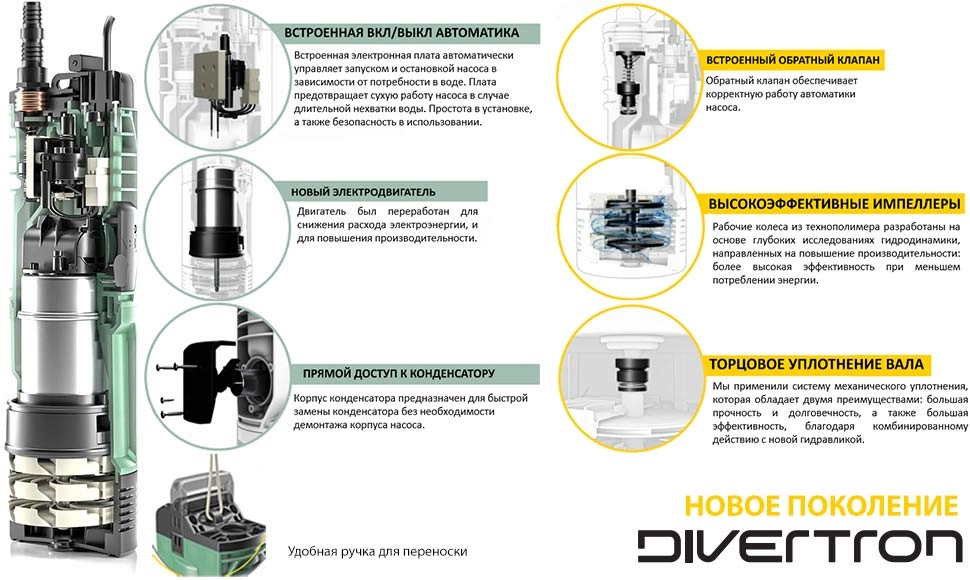 Купить Dab Divertron 900 M - значит приобрести насос для колодца второго поколения с более совершенными характеристиками, чем насосы предыдущей версии. Из основных отличий - новый, более производительный и экономичный электродвигатель, усовершенствованная автоматика, удобный доступ для быстрого монтаж/демонтажа конденсатора, удобная ручка для переноски и др.