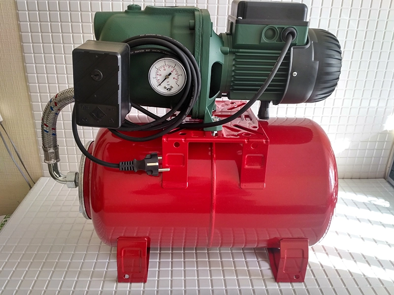 Мембранный бак: 20-литровый горизонтальный, с бутиловой мембраной внутри, с кронштейнами для крепления насоса, а также, всей станции к полу.