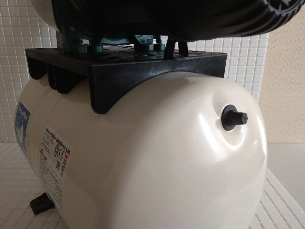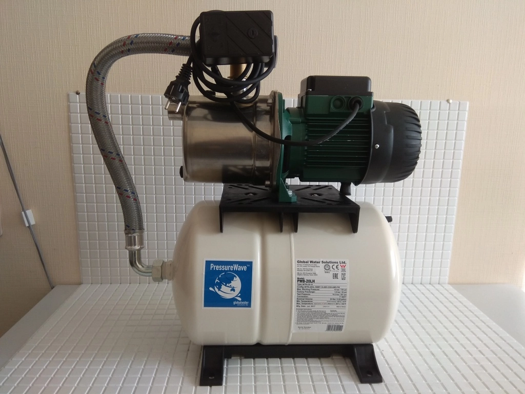 Мембранный бак: 20-литровый горизонтальный, с несъемной диафрагмой внутри, с кронштейнами для крепления насоса, а также, всей станции к полу.