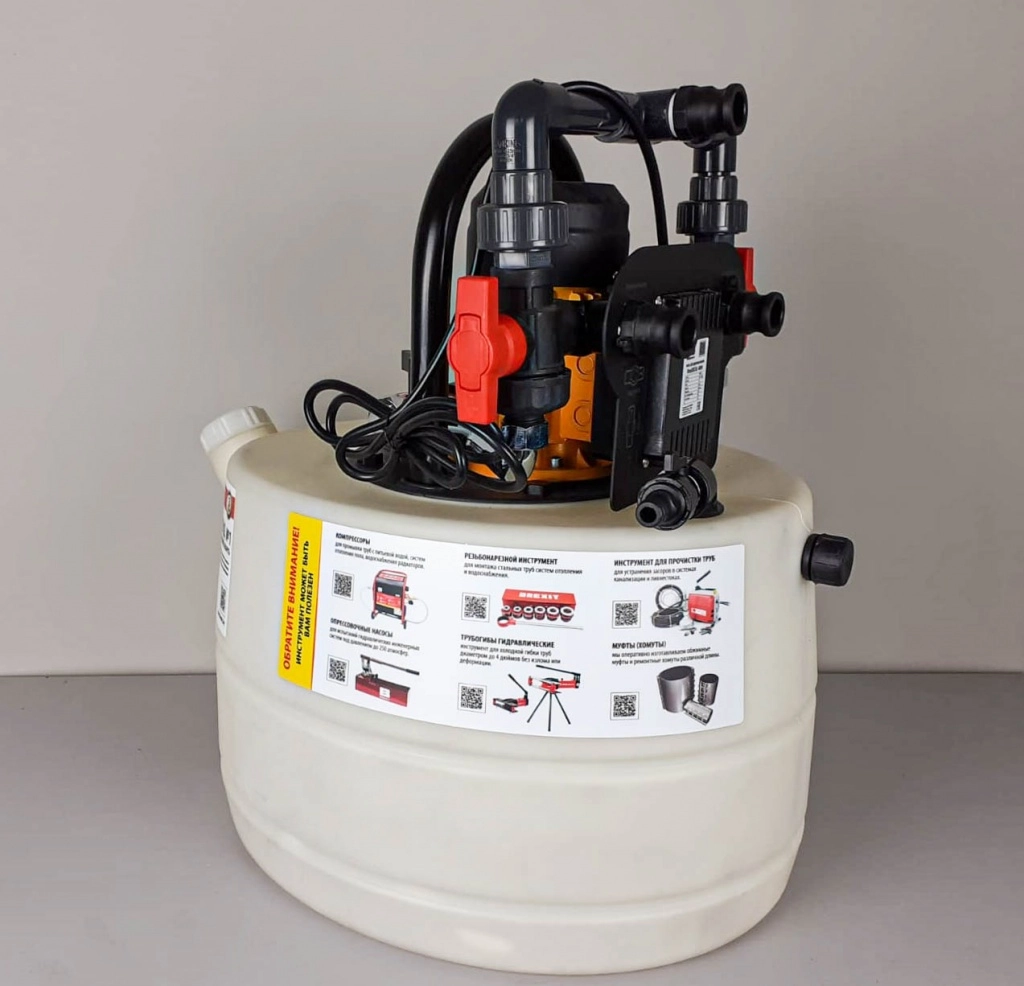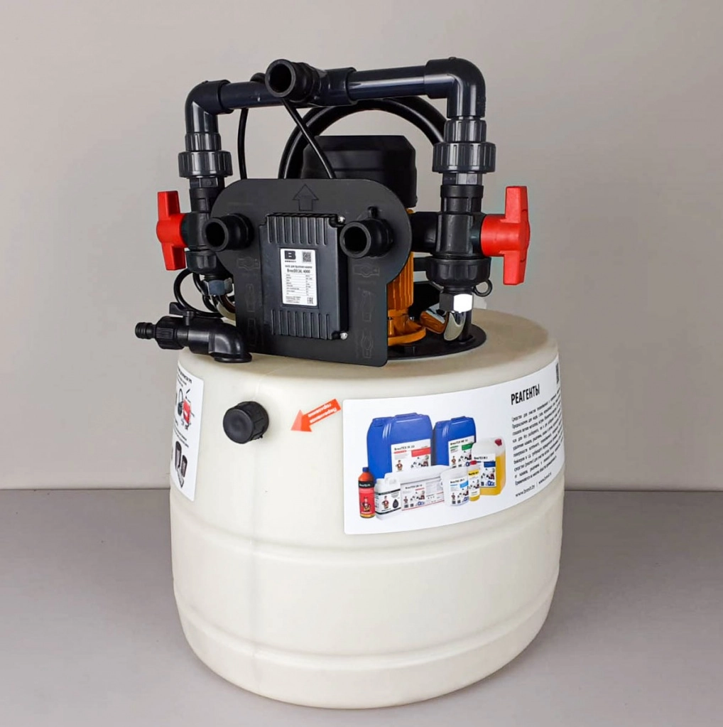 Установка для химической промывки теплообменников и систем отопления. Установка используется для очистки / промывки различных замкнутых жидкостных контуров, таких, как разнообразные теплообменники или каналы охлаждения формообразующих пресс-форм. Это устройство предназначено специально для очистки замкнутых систем от накипи, различных органических отложений и ржавчины. Очистка достигается разнонаправленной попеременной циркуляцией через замкнутую систему 10-15% раствора специальной очищающей жидкости. Автоматический инвертер потока позволяет воздействовать на загрязнение с обоих входов контура, что делает установку особенно успешной в случае когда система практически полностью засорена.