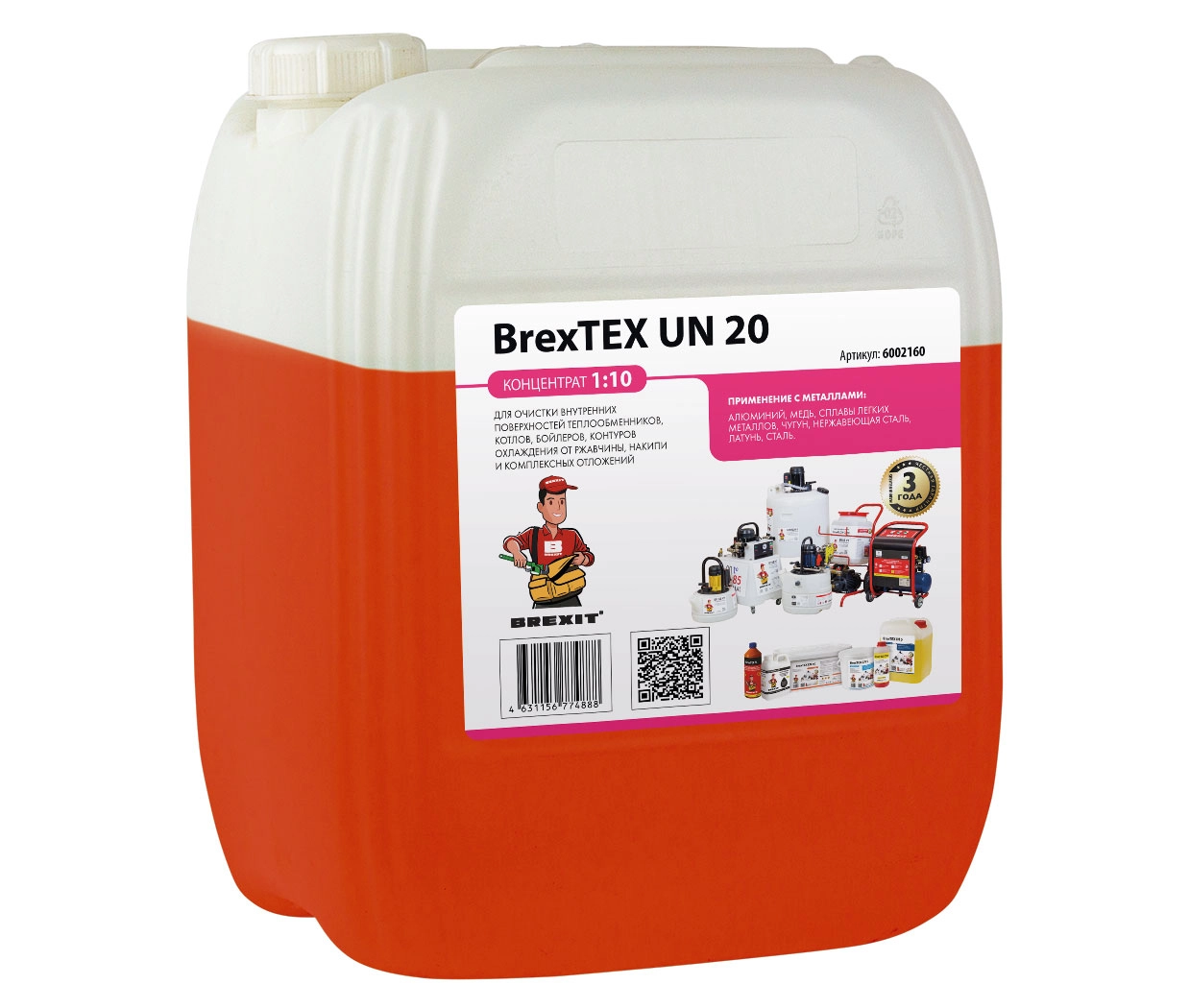 Реагент для промывки BrexTEX UN применяется в кожухотрубчатых и пластинчатых теплообменниках, газовых, жидкотопливных, твердотопливных котлах состоящих стали, нержавеющей стали, меди, алюминия, сплавов легких металлов. Имеет низкую степень воздействия кислот на металлы.