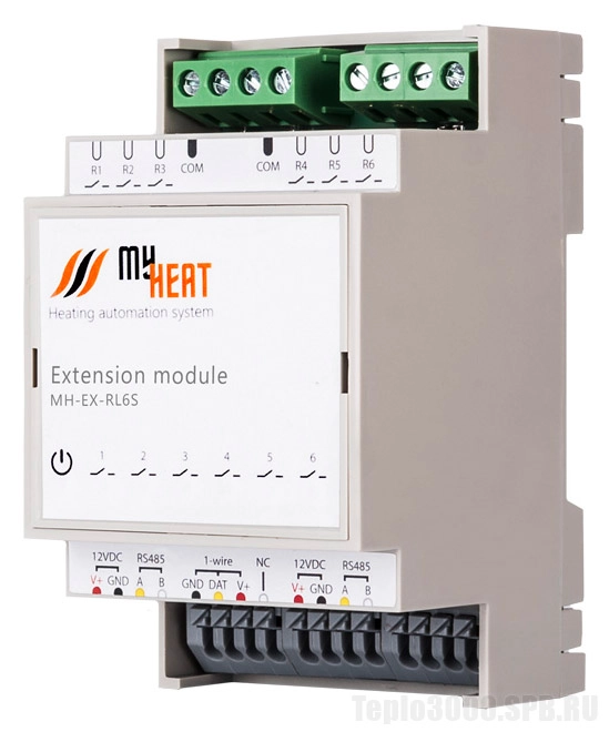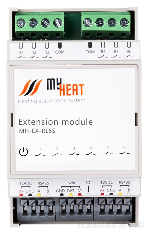 Симисторный блок расширения MyHeat RL6S подключается к контроллеру по проводной шине и предназначен для бесшумной коммутации дополнительных шести выходов электрической нагрузки посредством симистора.