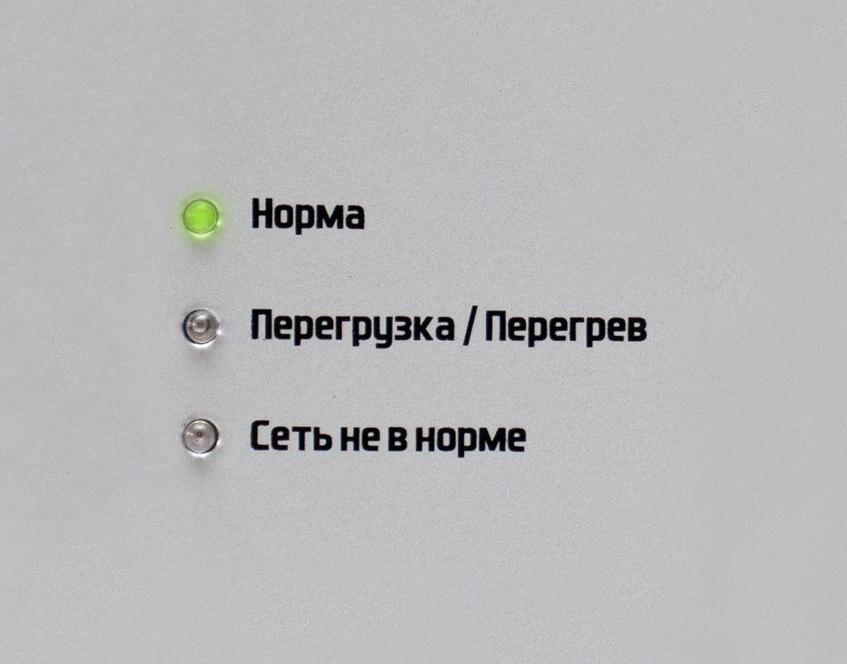 - «Сеть не в норме» – светится при выходе сетевого напряжения за рабочие пределы (менее 90 В или более 310 В).