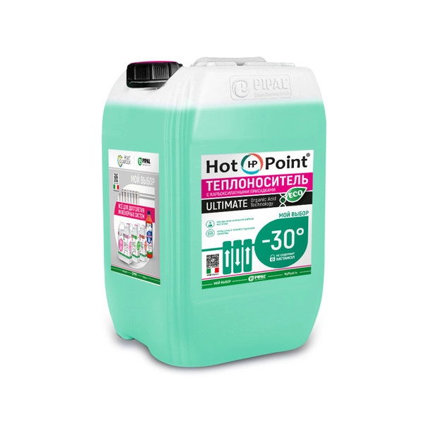 Теплоноситель (хладоноситель) HotPoint ULTIMATE ЭКО 30 предназначен в первую очередь для использования в автономных системах замкнутого типа, в частности в двухконтурных котлах и в системах вентиляции, кондиционирования. Серьезным преимуществом теплохладоносителей HotPoint ®, является наличие присадок обеспечивающих защиту системы от коррозии.