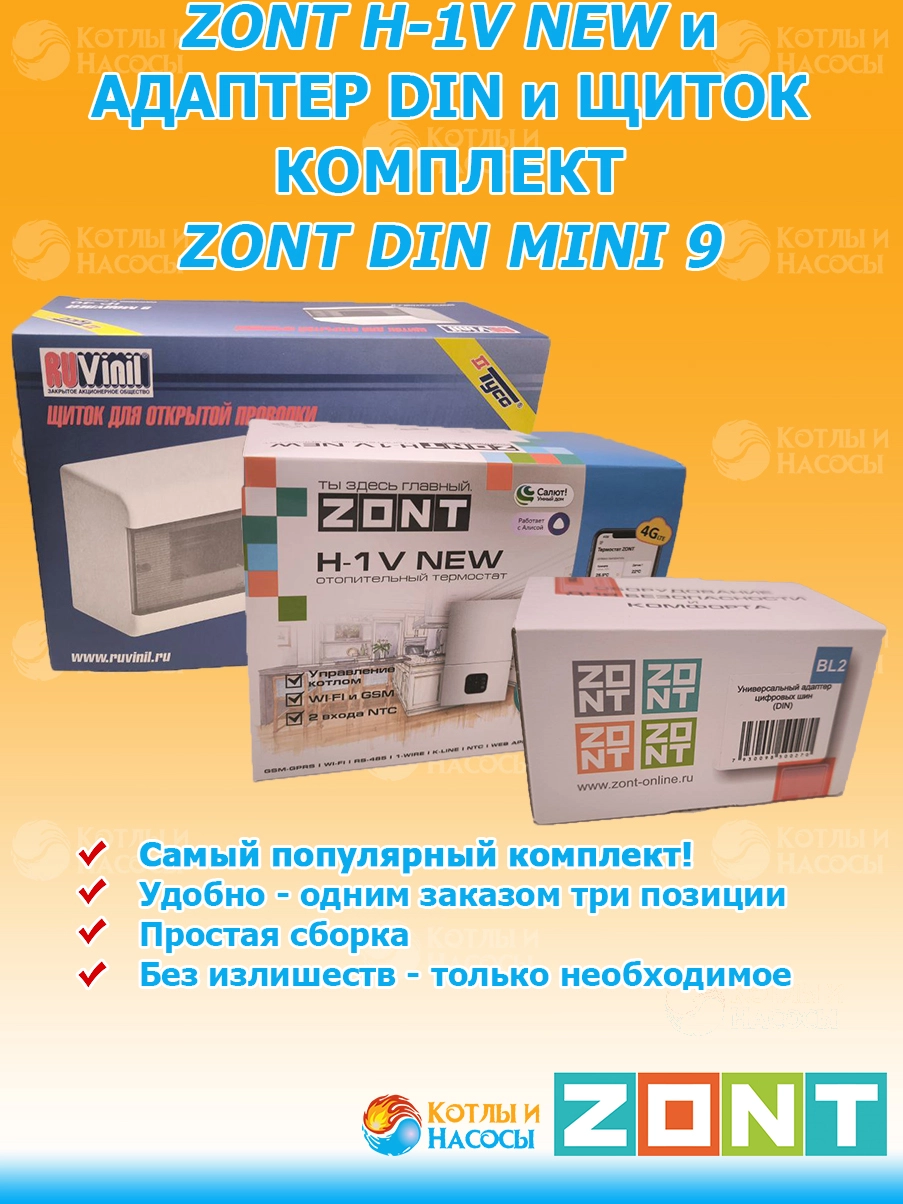 ZONT H-1V NEW и Универсальный адаптер цифровых шин DIN и модульный щиток Комплект ZONT DIN MINI 9